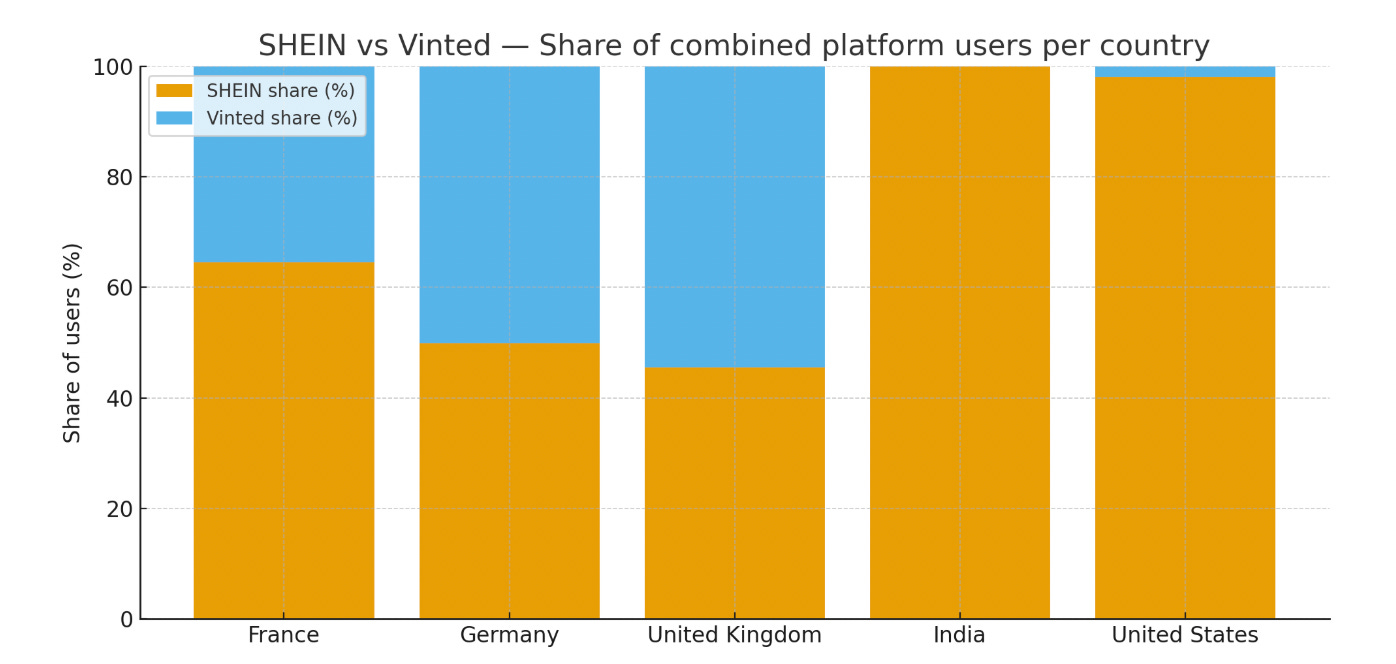 While Vinted is the biggest ecommerce player in the French market, by % share of users in France, SHEIN takes the bigger pie.
