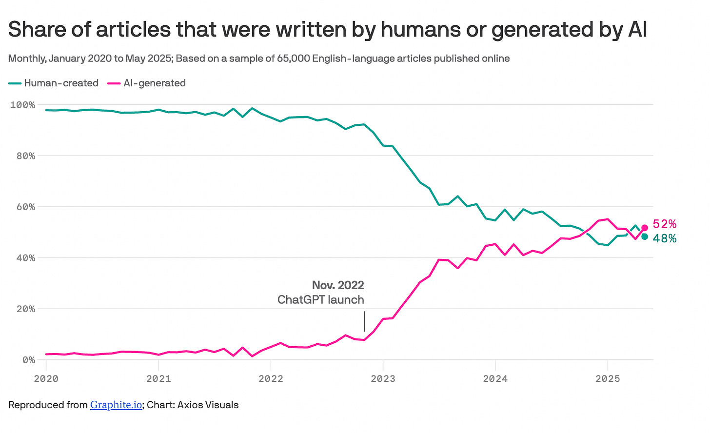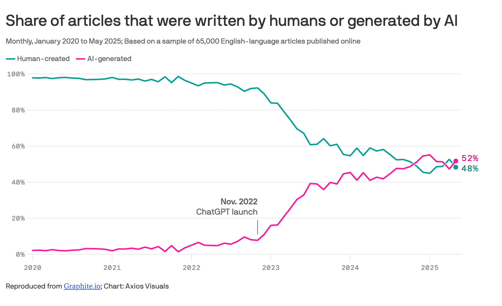 The graph is from a study conducted by Graphite, using an AI detector to analyse a random sample of URLs from Common Crawl, which is an open source database of over 300 billion web pages.